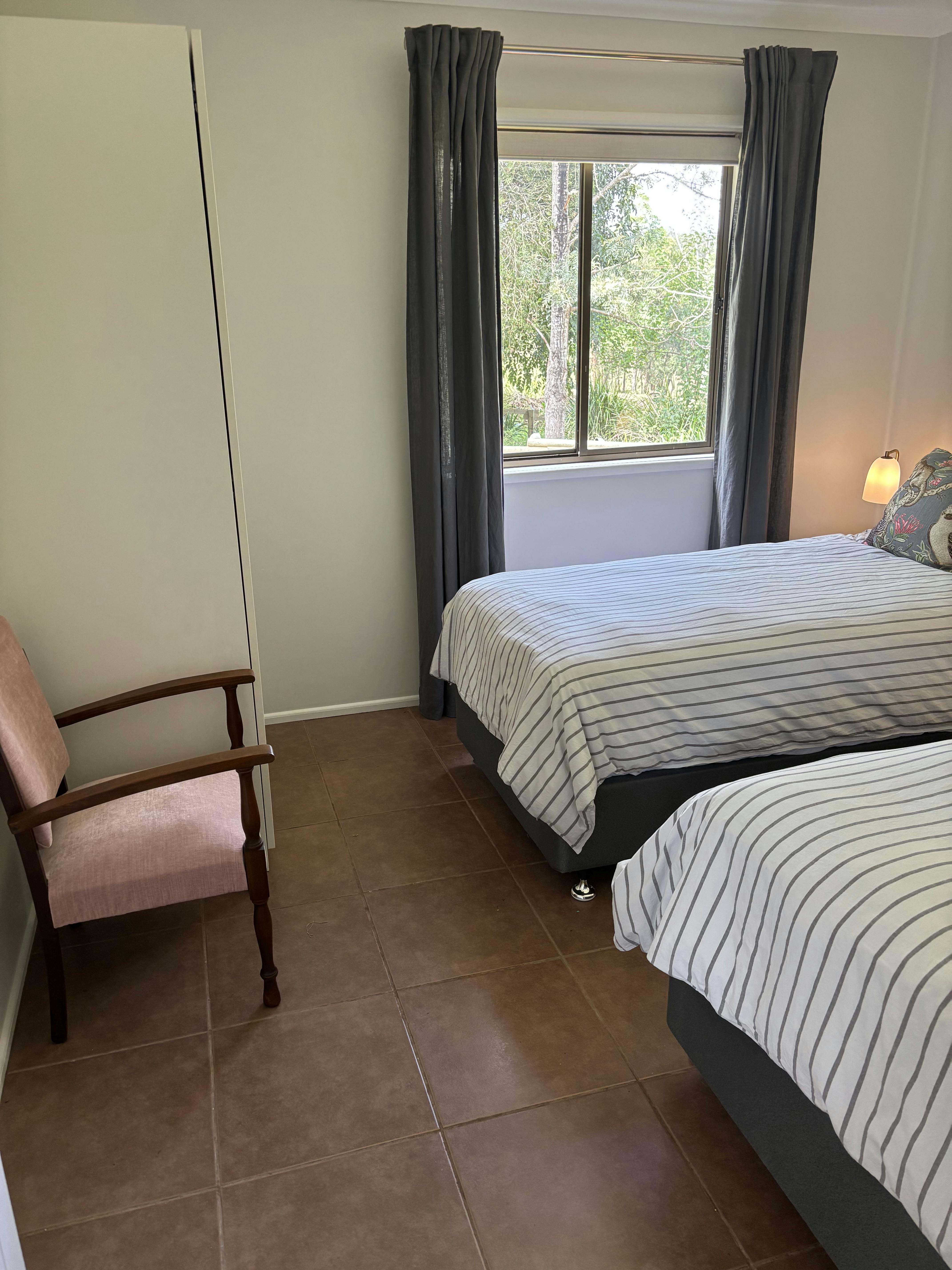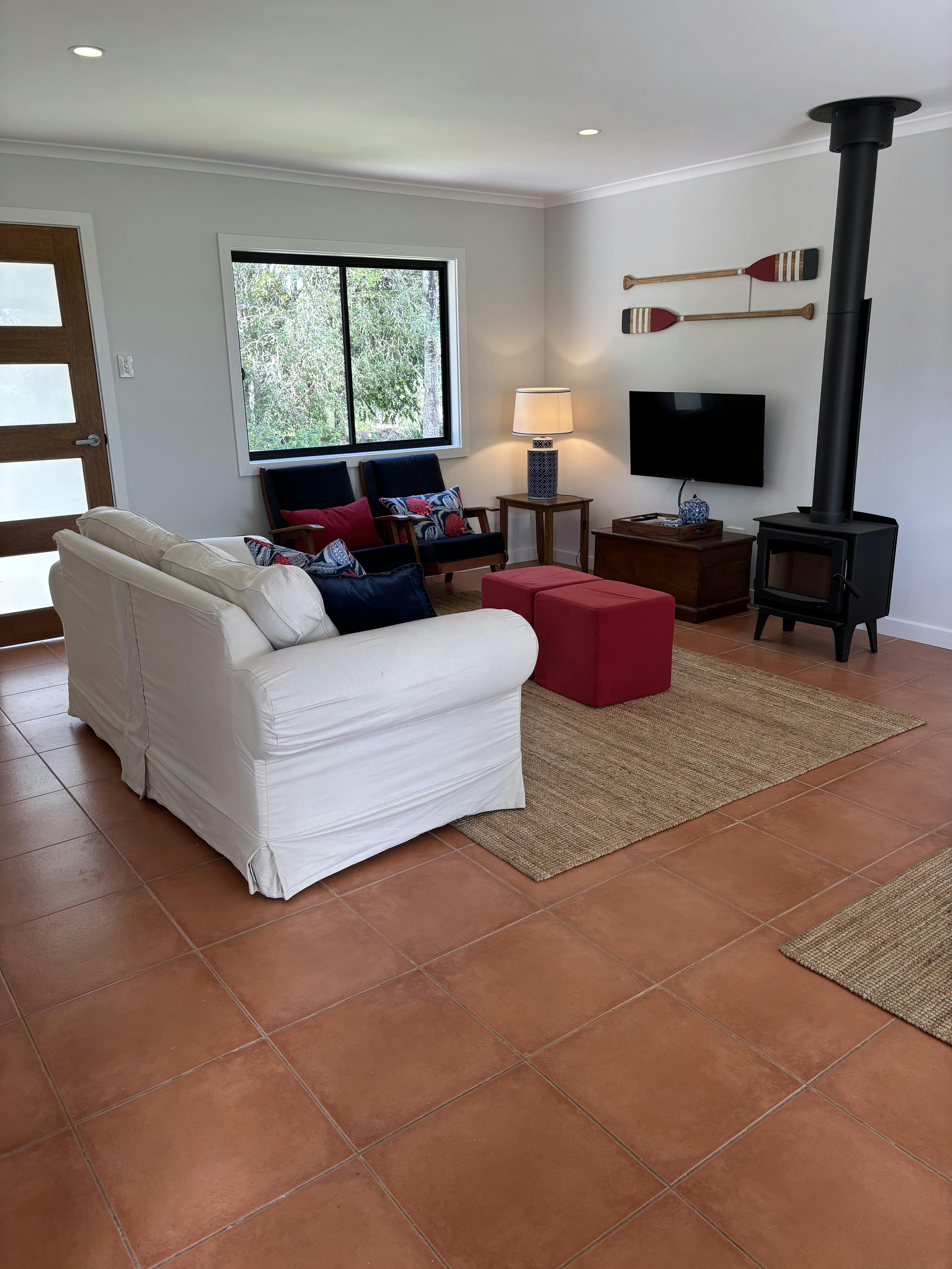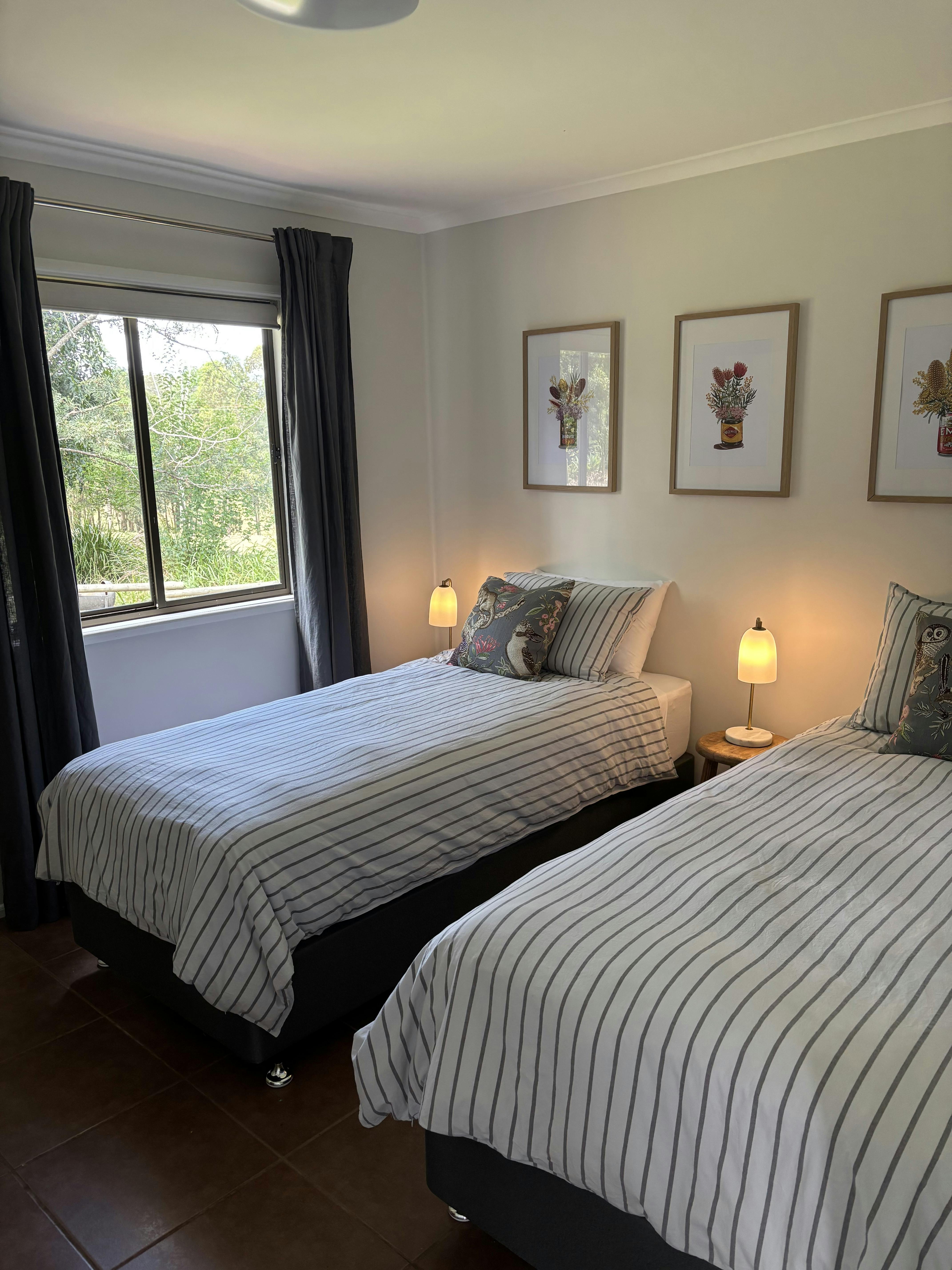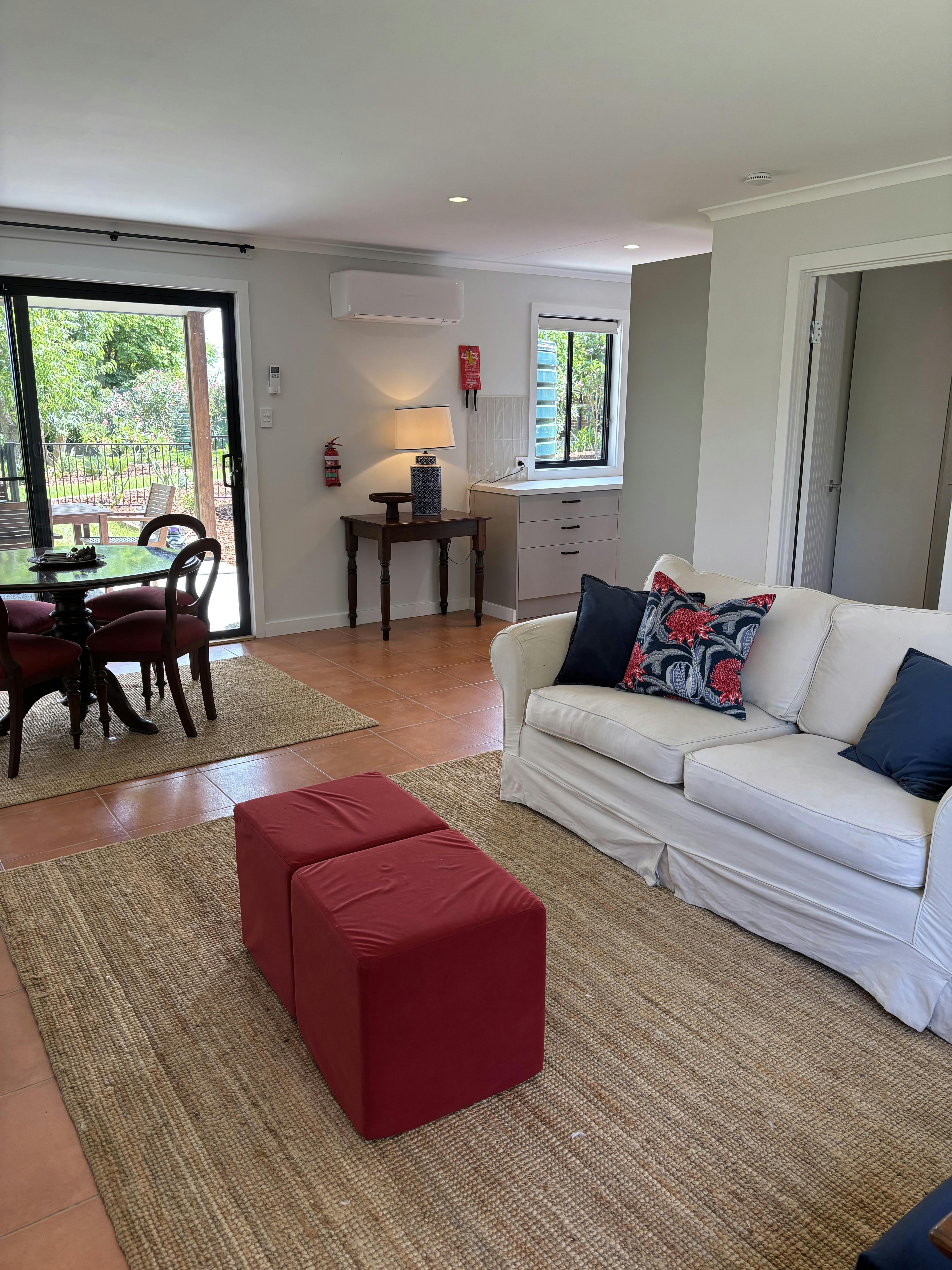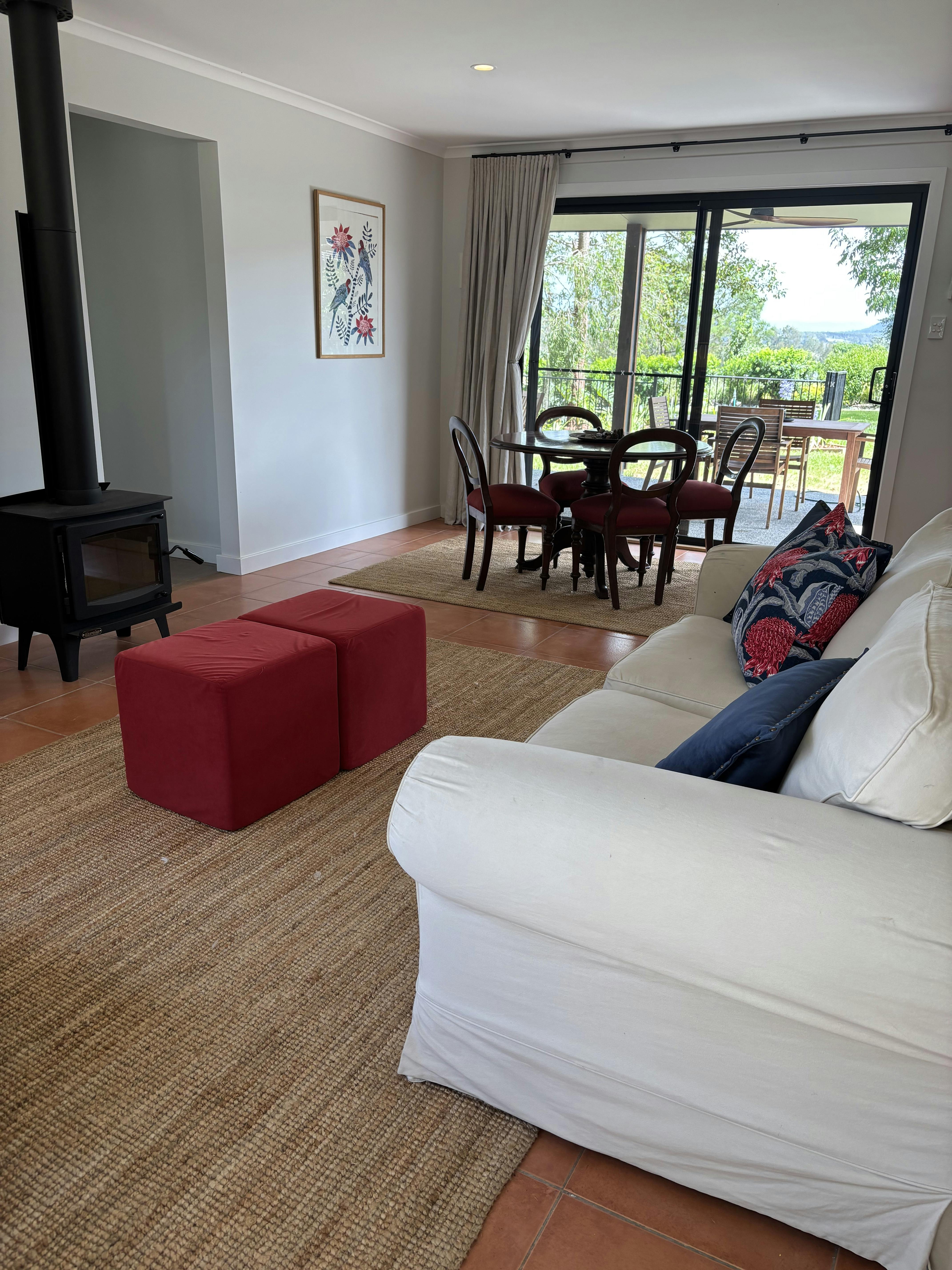Stylish, freshly renovated and spacious, this 2 bedroom, 2 bathroom cottage with large undercover outdoor area and firepit is the perfect place to put your feet up and relax. Fully equipped kitchen, air-conditioning, indoor slow burner wood fire, one queen bedroom with ensuite and one bedroom that can either be a king bed or twin singles. Beautiful river and country views, a fully fenced backyard, dog friendly and only a short stroll to the gorgeous shared guest swimming pool and river access. Plenty of space for kids and dogs to run with 16 acres of lawns, gardens and bush. Explore, stroll, enjoy spotting birds and wildlife or just sit back with a glass of wine and enjoy the view.