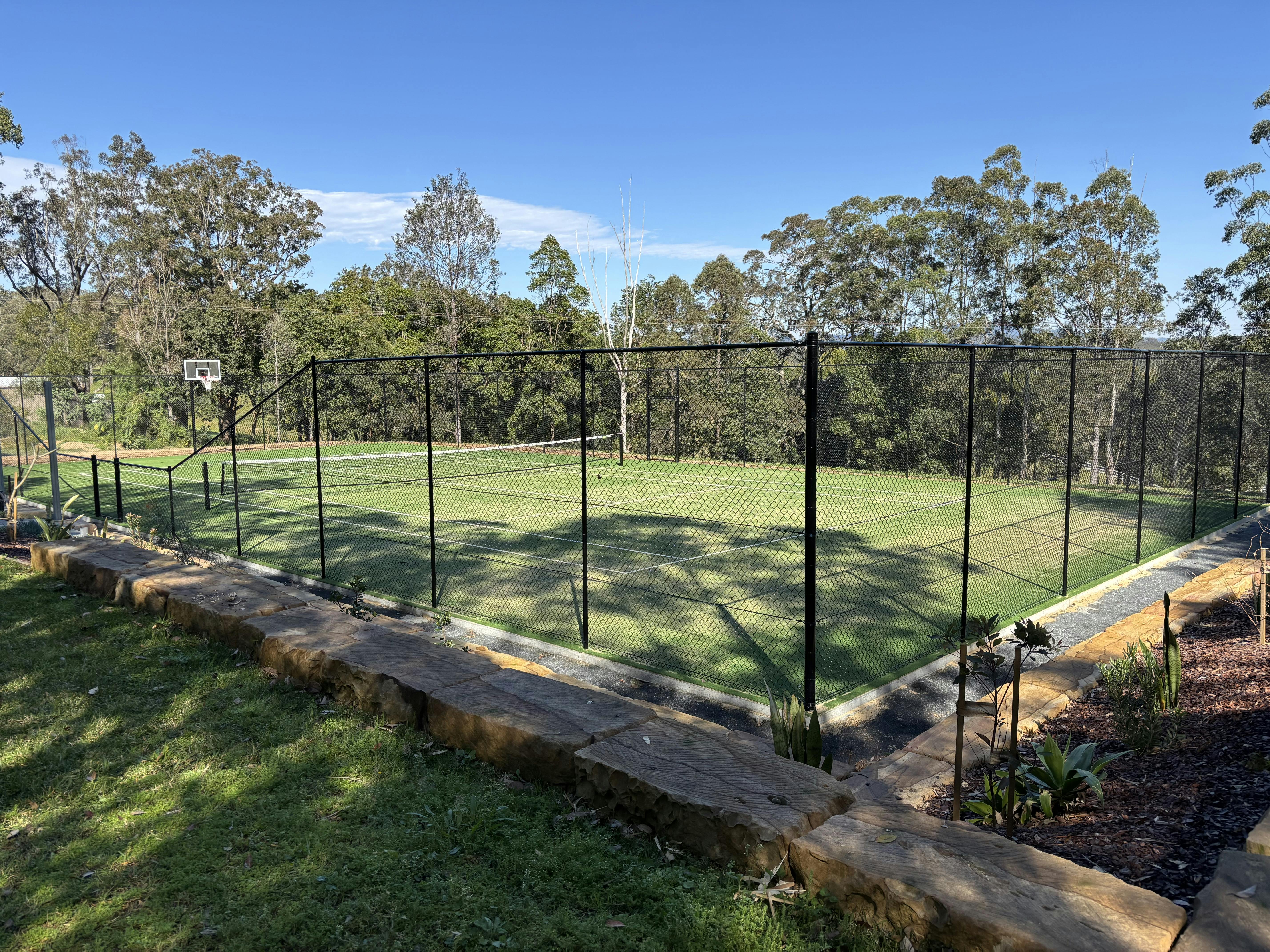 Then there is the pool. We have a heated guest swimming pool with plenty of room for relaxing, either on the daybeds, under the umbrellas, or cooling off in the water. We have also just installed a new artificial grass tennis court as well as a basketball hoop.